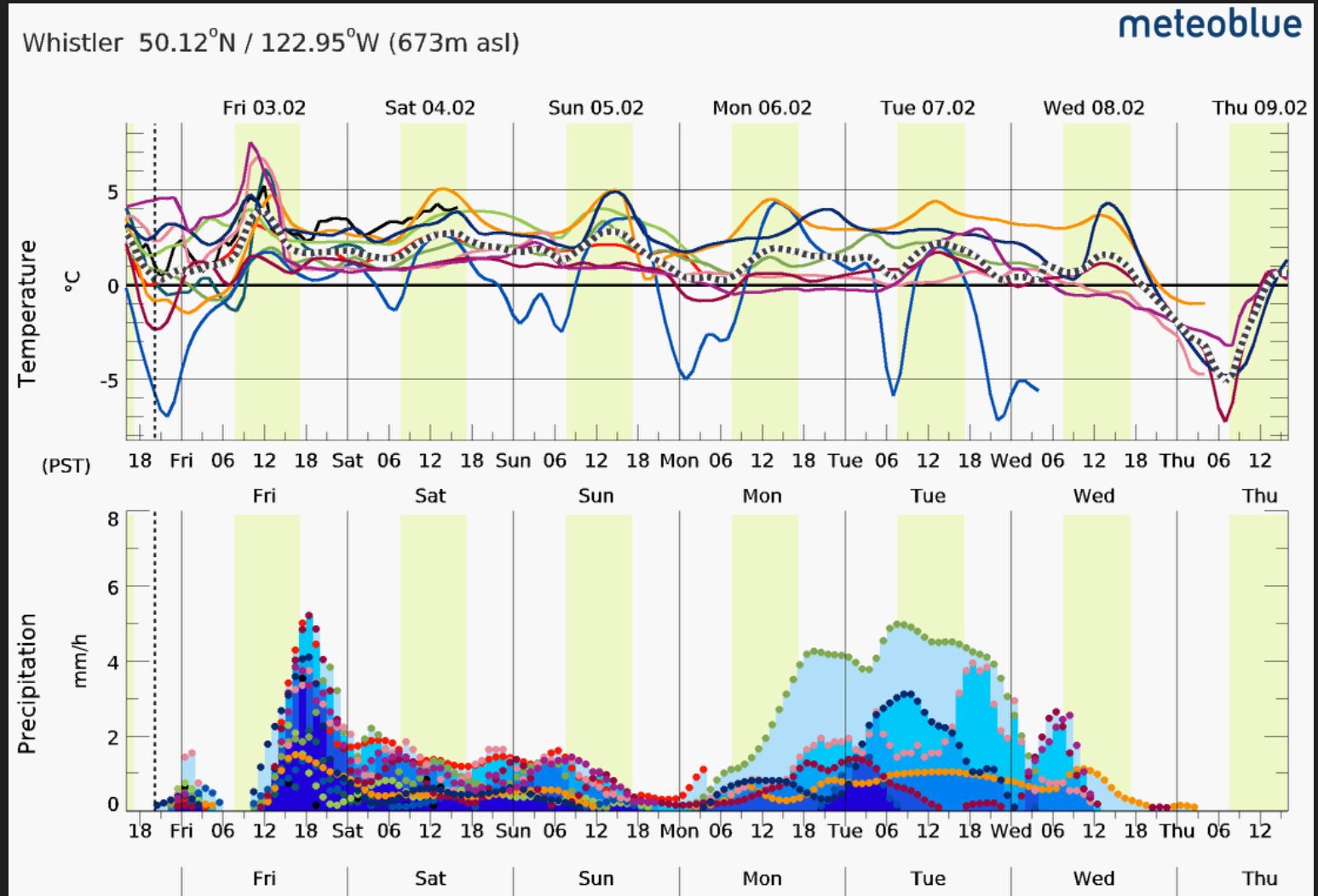 -How well will the new snow bond to the crust and how quickly can we step out after the storm? This is the biggest question! The mid-Jan crust was our biggest concern but it was generally bridged over by the newest crust that formed in this clear/cold snap (probably now called Feb 1 crust as it has begun to be buried). Hopefully new snow will stick well to the crust and storms will get successively colder to improve ski quality. It may not however and aside from the simple problem of storm slab during the storm, we may be back to worries about deeper triggering on the old mid-Jan crust. We’ll be trying to get ahead of the storm and see how that new snow is bonding to the old surface. Is it sitting on facets or bonding well? Work the storm like a typewriter and move more interior as the storm arrives before resetting to the Coast when the big loads settle out!