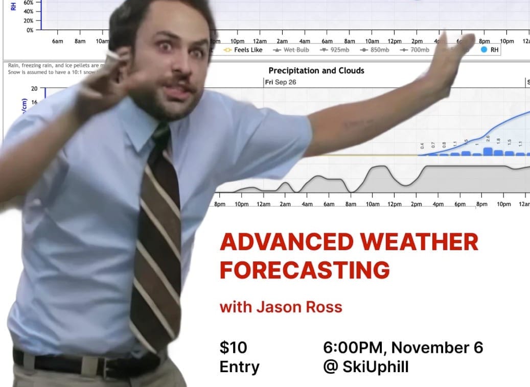 We’ve also got an event to let you in on. Our in-house meteorologist Jason Ross will be giving a presentation at SkiUphill on November 6th. His advanced weather forecast talk will be a deep dive into how he produces the forecast we include in our newsletter each week. He will review resources you can use in your own weather research. Grab a ticket at the link below!