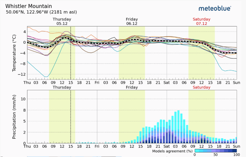 Left: Image of the day from GOES18 West. Look at that plume of moisture hitting western Canada! Right: Meteoblue Multimodel forecast for Whistler.