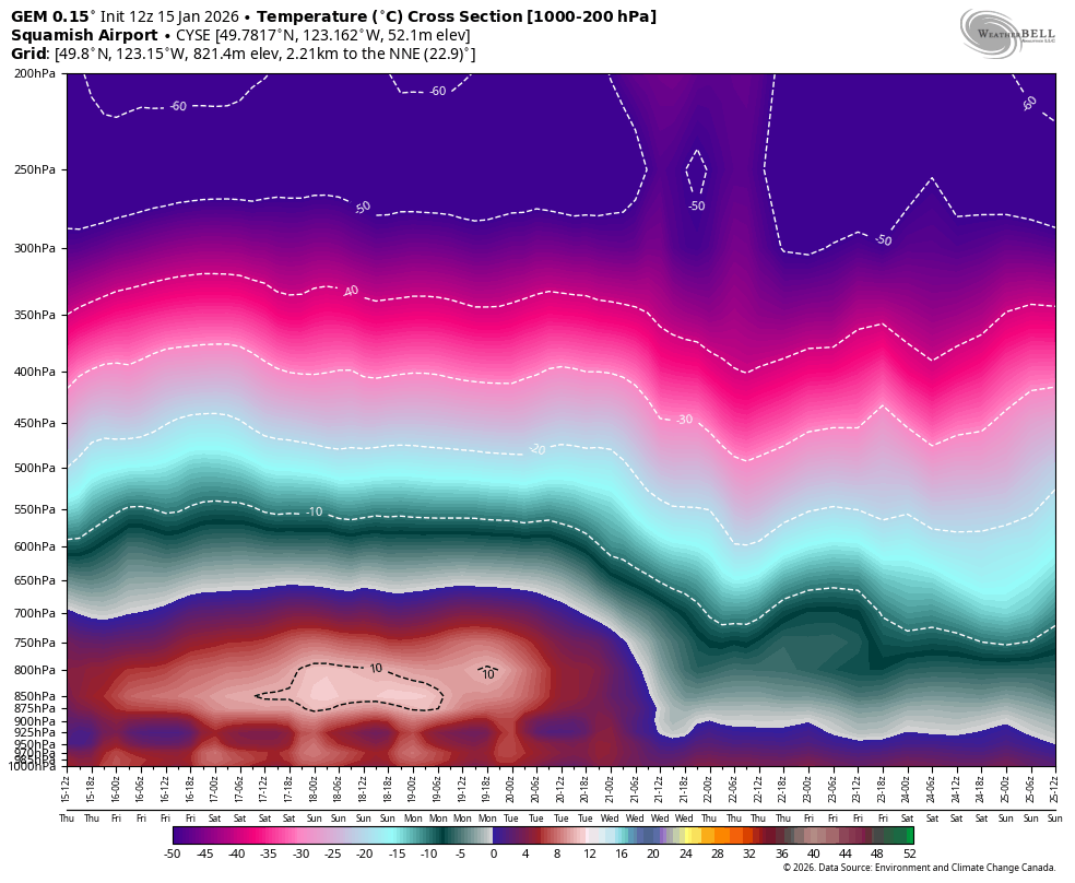 Meteogram for Whistler and the GEM model Temperature Cross Section showing a below freezing layer at low elevations over the S2S (especially over the Pemberton valley).