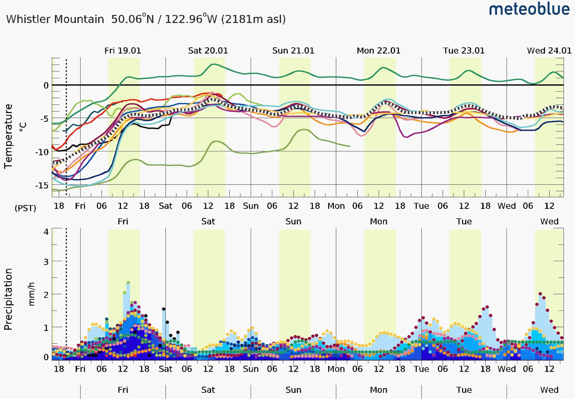 Sadly, freezing levels spike to ~2000m on friday with 20-40mm of precipitation in the forecast. The further north and east in the corridor, the lower both the freezing level and precip amounts but confidence in storm intensity is low. It’s quite hard to tell exactly how much snow we should expect but this doesn’t look like huge amounts.