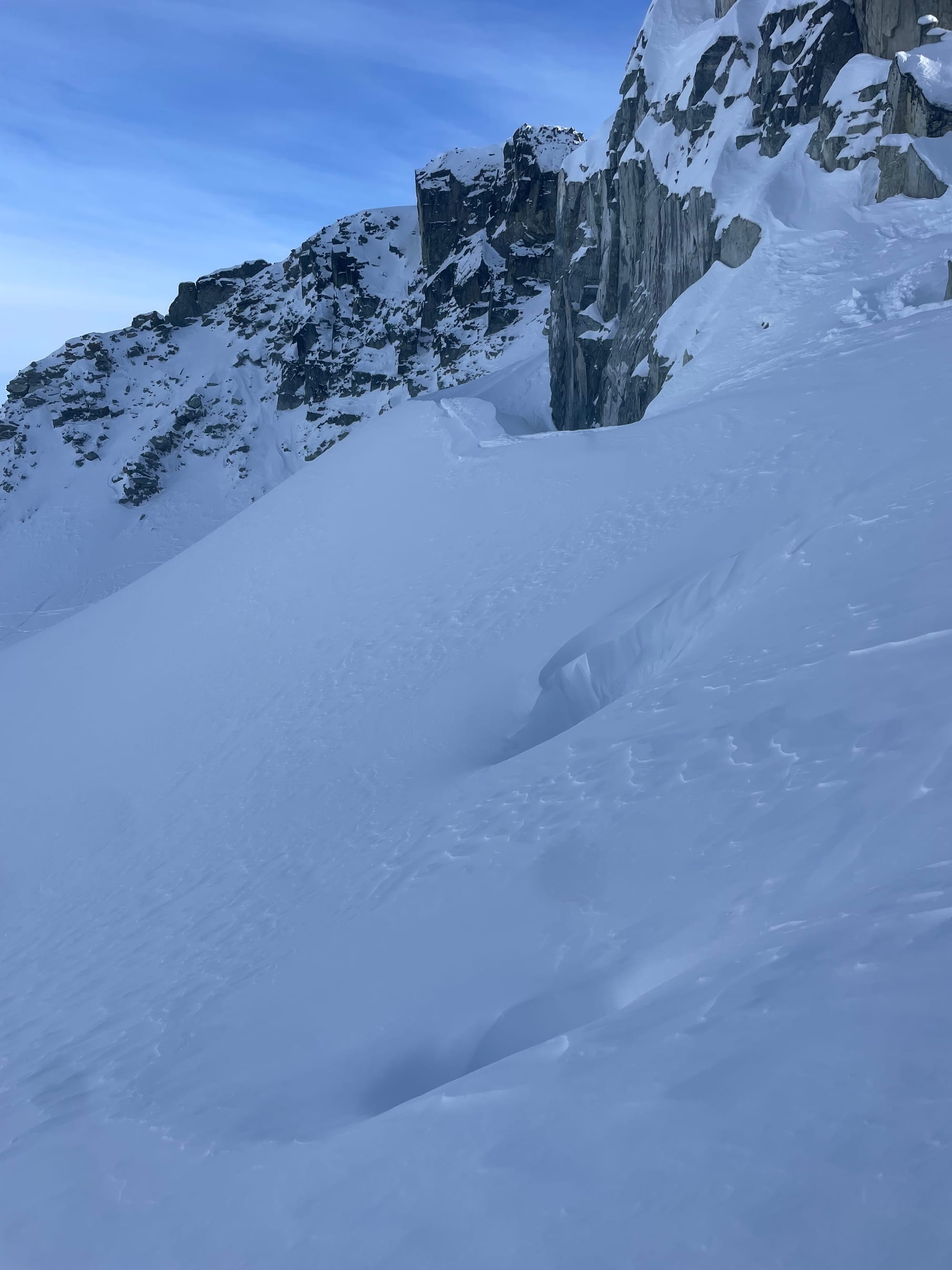 Hard to imagine anyone hasn’t noticed, it’s been cold! Much more seasonable temps brought snow to sea level. Small refreshes have helped maintain ski quality but overall, the snowpack is still very thin. Several wind events related to the arctic outflow weather patterns caused significant reverse loading. These are northerly winds and, depending on the topography, can cause fairly chaotic windslab formation, but especially on south facing slopes. However, it was blowing hard enough that many south slopes went beyond loading to getting stripped or pressed - meaning in the wind hit locations, very few snow surfaces were left unaffected. This was obvious on Rainbow the other day before our last refresh. The Spearhead range seemed to avoid the worst of the outflows and generally was providing some settled fun skiing with little evidence of natural activity or even human triggered slides. Thursday in the Sky Pilot zone we saw shallow sensitive slabs forming near ridge crests.