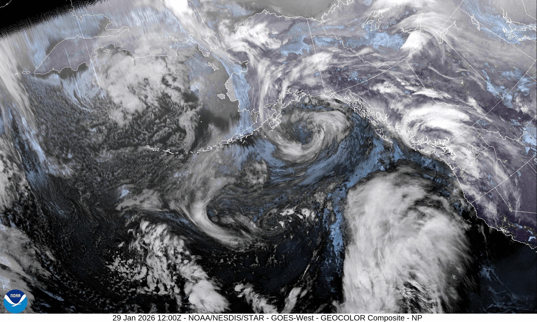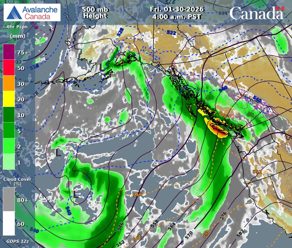 Avalanche Canada 500mb chart showing the green plume of moisture hitting the South Coast. GeoColor satellite imagery showing both storm systems.