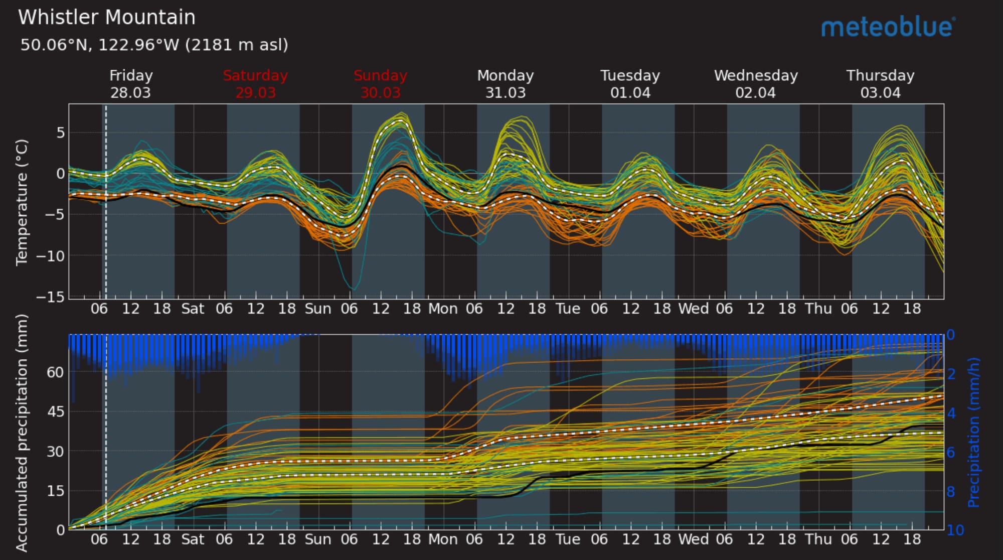 - Saturday - 5-10cm precip with light SW wind and FLs 1000-1800m.