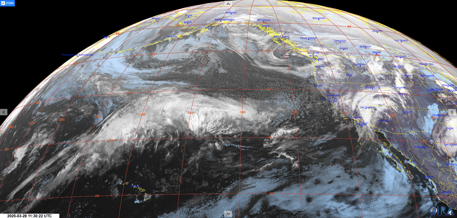 GeoColor imagery showing a trough of low pressure off the coast (L) - this is our current firehose. Meteoblue Multimodel forecast for Whistler (R).