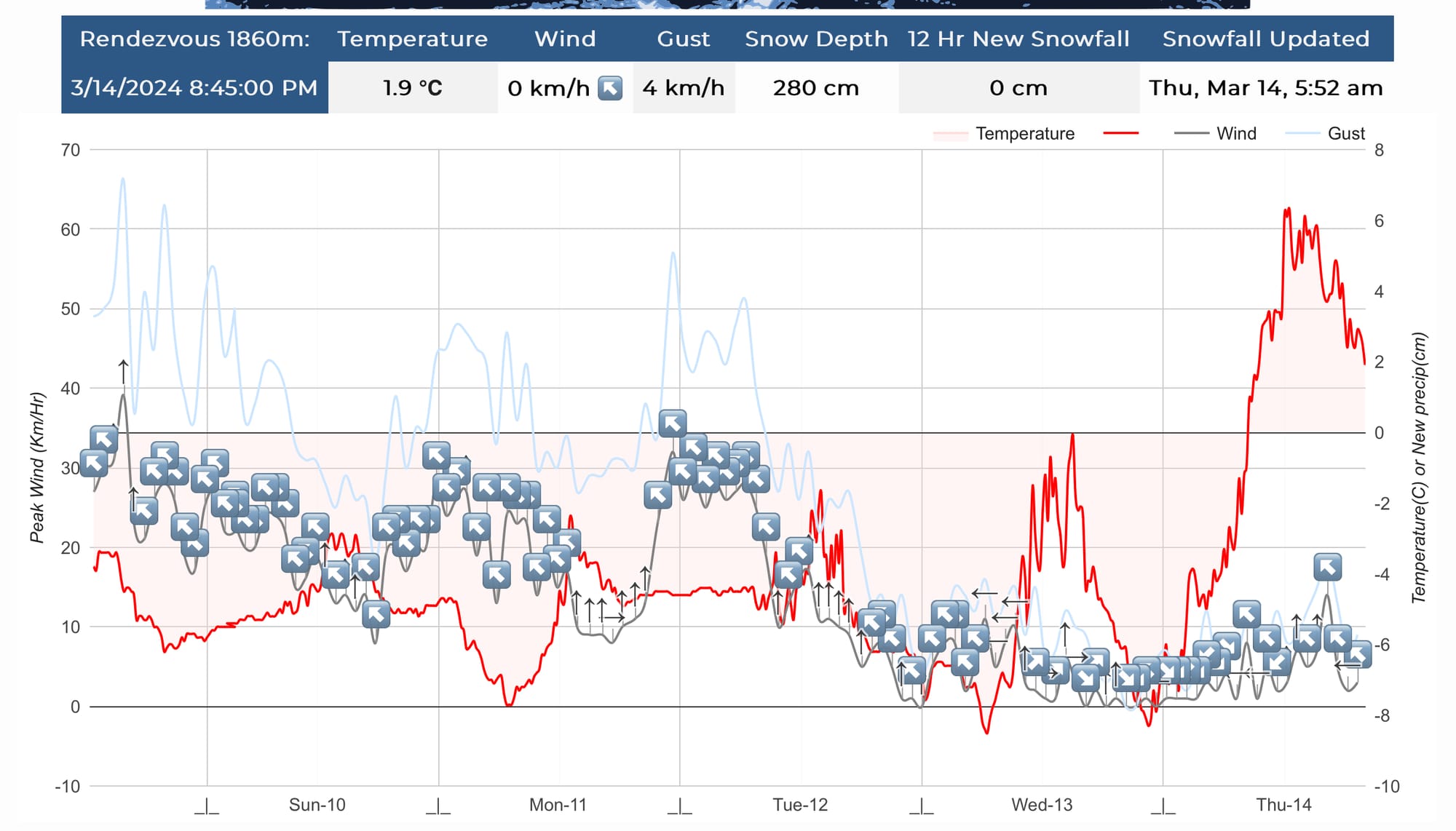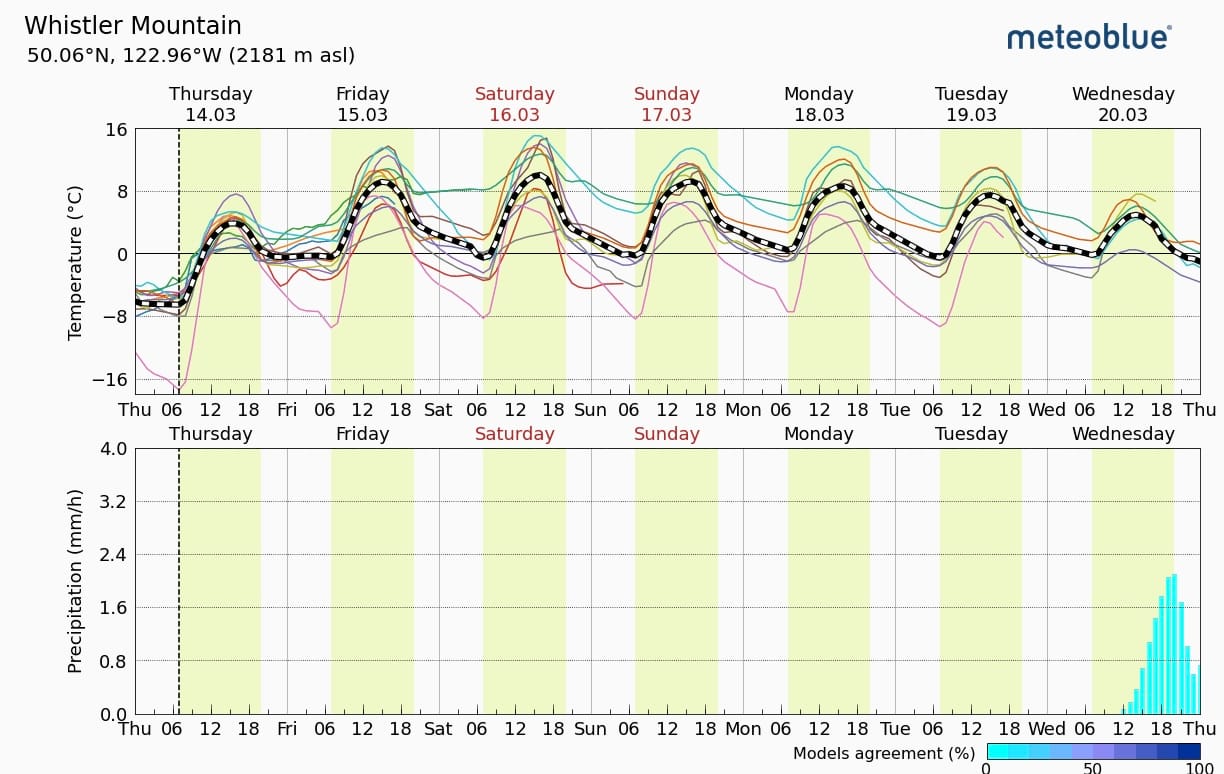 At least this part is easy. For the 7 day forecast, we have freezing levels of ~3500m, so a daytime high of +5 to +8 deg at 2000m and overnight lows of around 0 deg. Wind will generally be calm and the sky will be clear. It’s going to be beautiful at least!