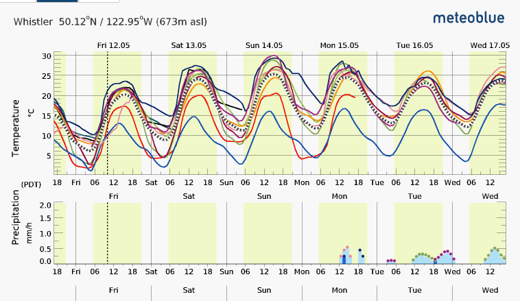 We have a high pressure ridge building over the South Coast meaning it’s going to be very warm and dry through monday at least! As you can see in the MeteoBlue forecast below, Whistler could see daytime highs near 30 degrees on Sunday! Overnight lows will still be in the mid-teens so we’ll see what that means in the alpine but I don’t expect great overnight freezes. If you get out Sunday or Monday, go early and look for simple terrain! This will certainly cause significant snowpack loss and we’ll also see big bumps in streamflow.