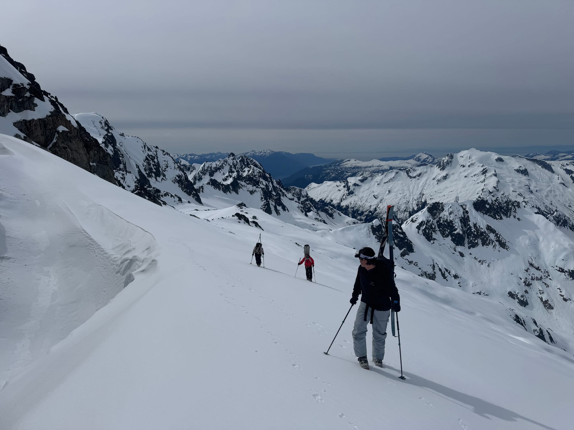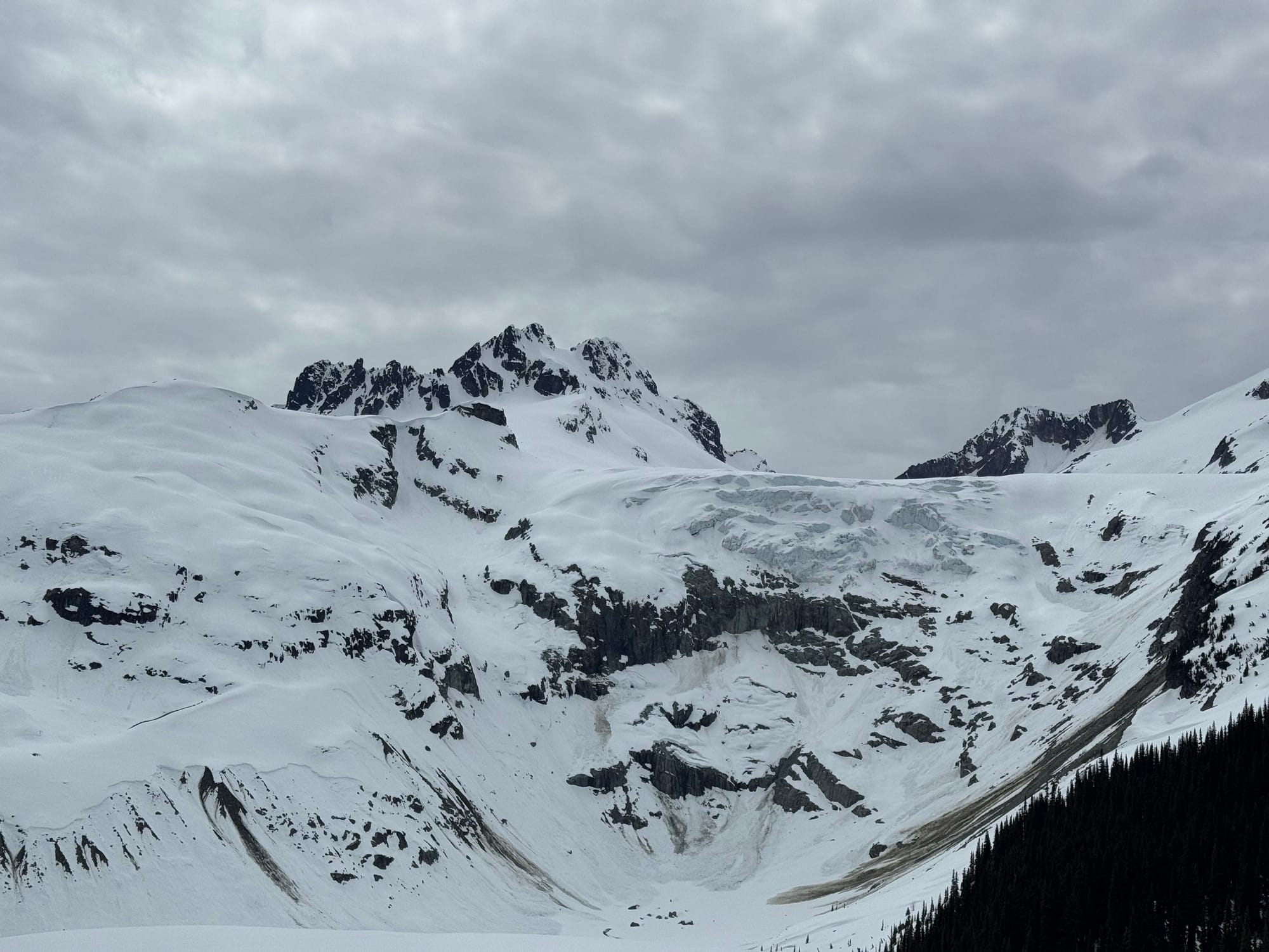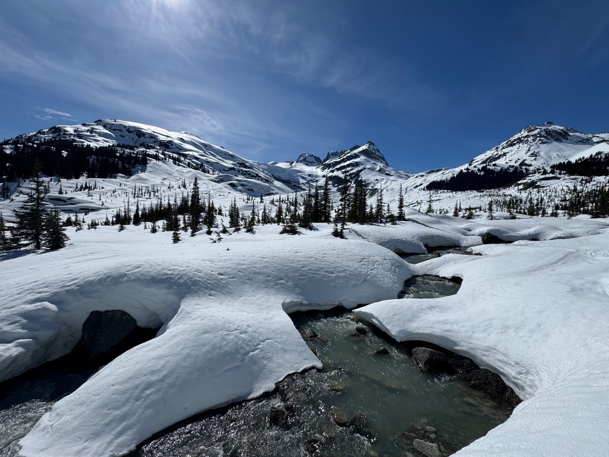 We’ve been in the Currie/Spearhead Range, the McBride as well as the Tantalus. Valley approaches are gross right now but alpine travel can be excellent. We’ve found 1450m to be about the magic number for where you’ll find snow cover in sheltered forest. Very sun exposed areas are a different story. It looks like the Lake Lovely Water Trail is snow-free nearly to the hut! Red Heather requires 2km of road walking to reach snow. Blackcomb is download only.