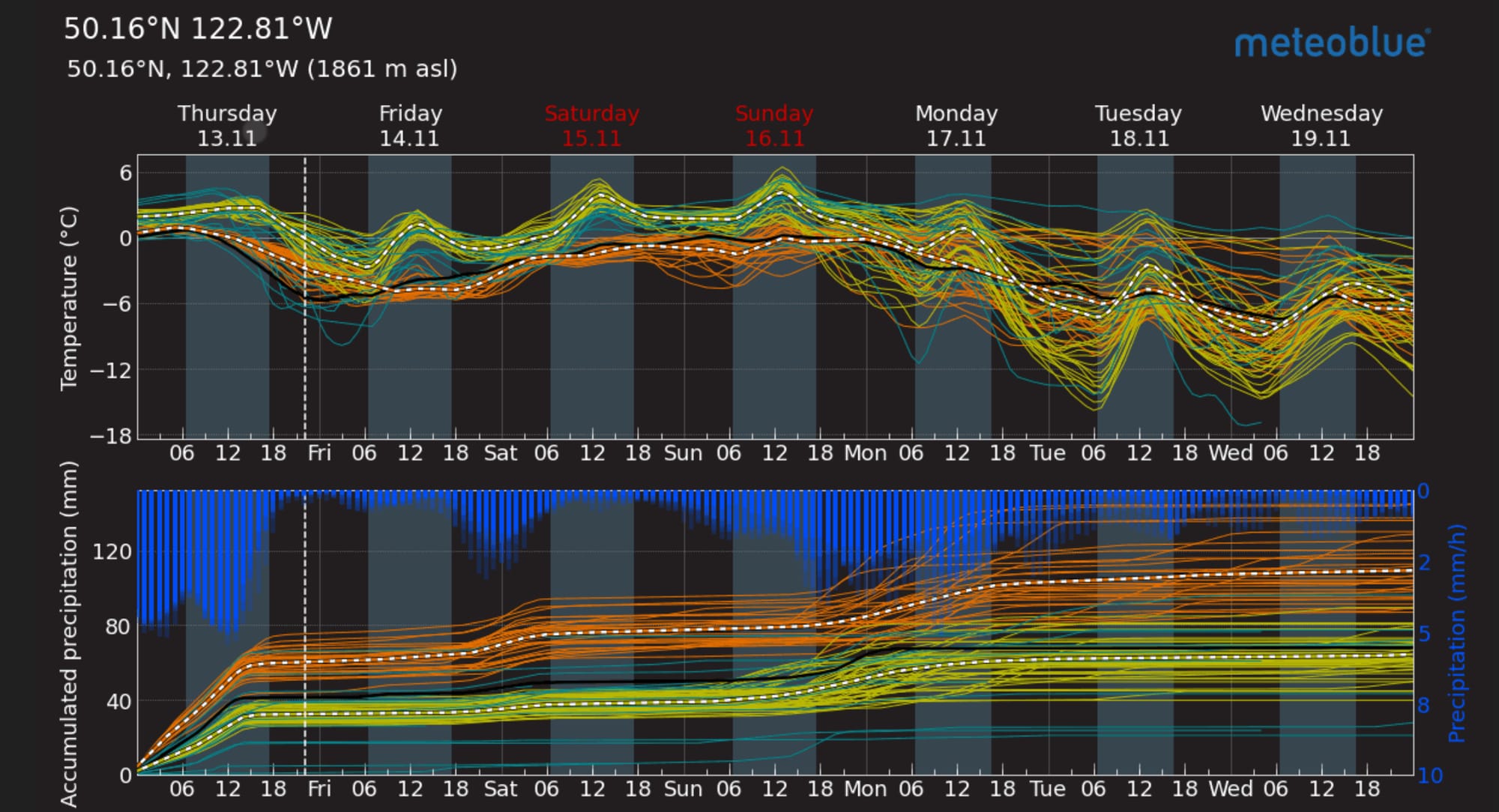 An active weather pattern is forecasted to continue through the weekend, with a series of systems expected to produce snow in alpine areas and rain in lower elevations. The first weak impulse will arrive later Friday into Saturday morning, bringing light precipitation, while the second impulse will arrive Sunday into Monday. This system will bring rising freezing levels, moderate to heavy rain in lower elevations and snow in high alpine areas. Early next week, temperatures are expected to cool, and freezing levels will decrease.